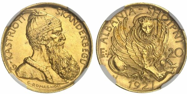 Albania, Ahmet Bey Zogu (1925-1939), 20 Franga Ari 1927, Au mm 21 g 6,45 di eccezionale qualità, in Slab NGC MS66