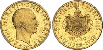 20 Franga, Rome, 1938 R, 10th Anniversary – Reign of King Zog, AU 6.45 g
